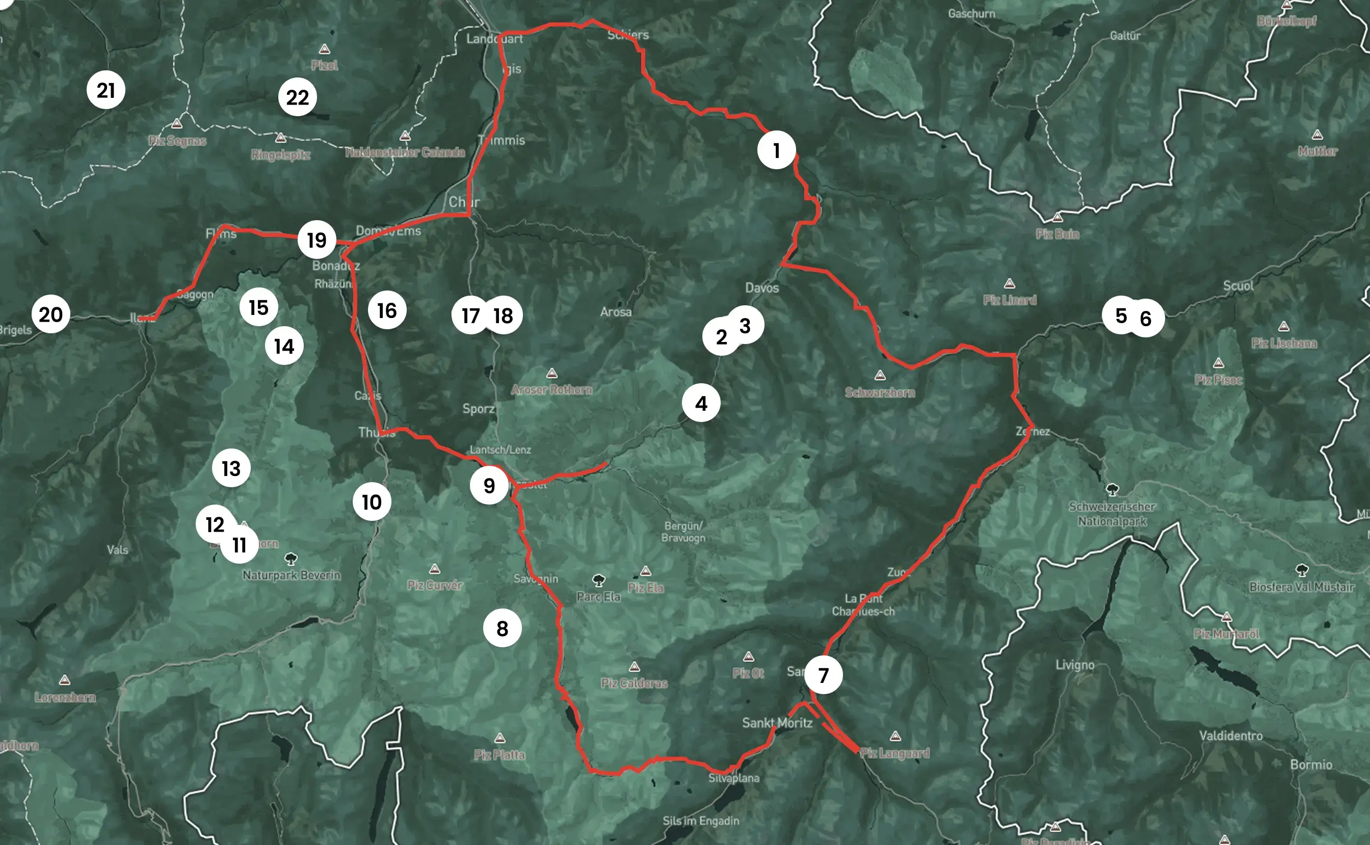 Die alpine Rundreise durch die Bündner Bergwelt verbindet die vier markantesten Sehenswürdigkeiten im Kanton, erkürt aber insgesamt etwas anderes zur größten Attraktion: Die Reise selber. Entlang der Strecke auf kurvenreichen Passtraßen, in wilden Naturpärken, an malerischen Seeufern oder auf entspannten Sonnenteraßen gibt es nämlich noch viel mehr zu entdecken.