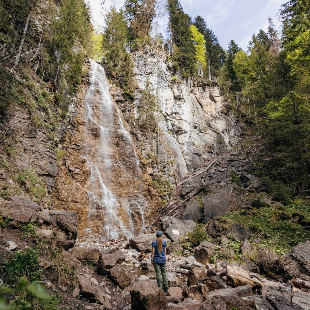 Wir reisen erst einmal mit den öffentlichen Verkehrsmitteln zum Schwarzsee in den Freiburger Voralpen. Raus aus der Stadt und ins Grüne. Die Gegend wird immer ländlicher und hügeliger, bis wir mitten in der wildromantischen Naturkulisse am Bergsee ankommen. Zumal wir reichlich Zeit haben, machen wir als erstes einen dreißigminütigen Abstecher zum Seeweidbach Wasserfall. Wer noch Stärkung für die Tour braucht, kann beim Hofladen “Fäschtus Biohüttli” direkt bei der Bushaltestelle Schwarzsee Campus, am Startpunkt der Wanderung, einkaufen.