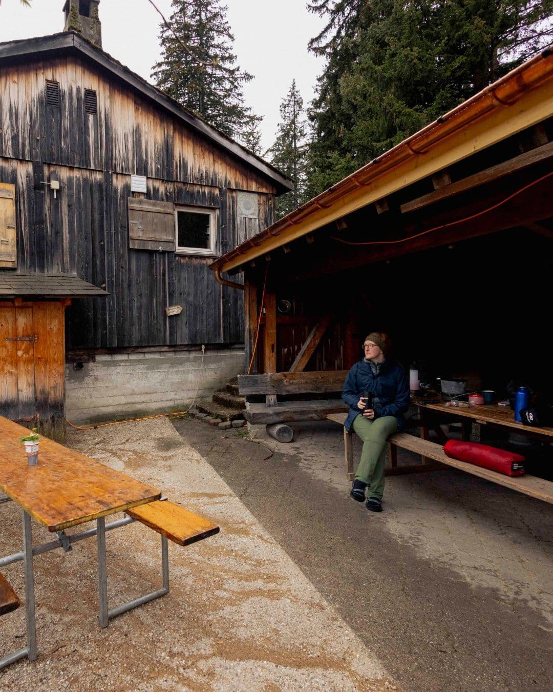 Der neue Tag bricht an und bringt Gewitter mit sich. Wir nehmen uns Zeit und essen unter dem gedeckten Sitzplatz Frühstück. Eigentlich würden wir nun noch 6 km weiter wandern, hoch zur bewirtschafteten Birehütte, zum Gantrischseeli und zum Schluss vor zum Berghaus auf dem Gurnigelpass. Doch wir entscheiden uns dem Wetter entsprechend den Bus direkt ab Schwefelbergbad zu nehmen und machen uns auf den Heimweg.