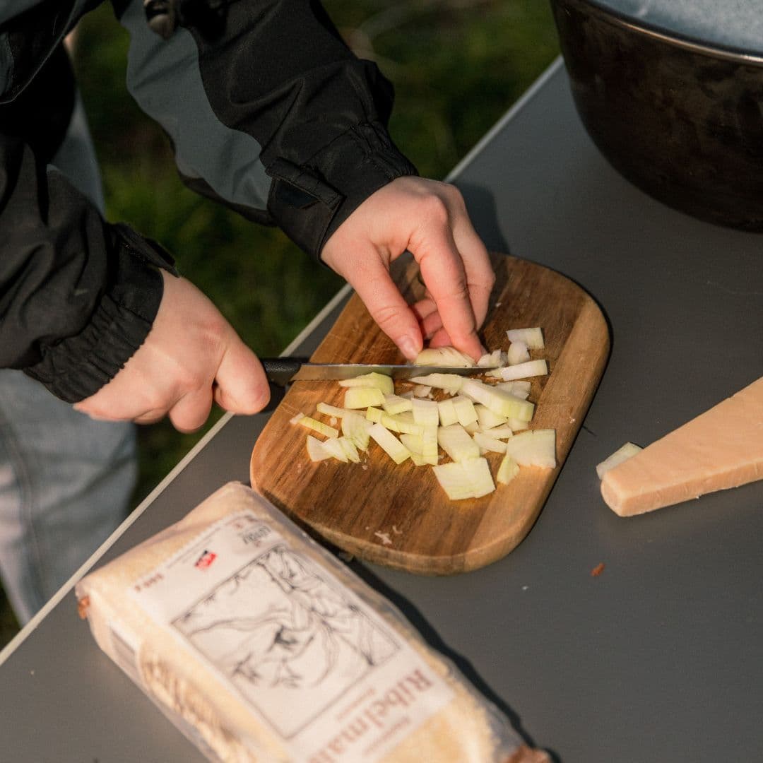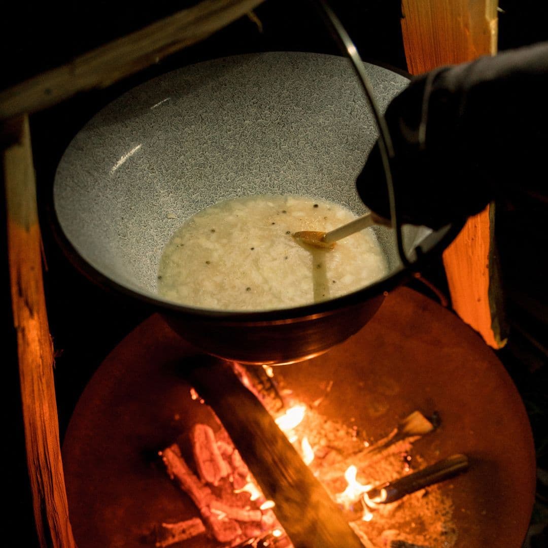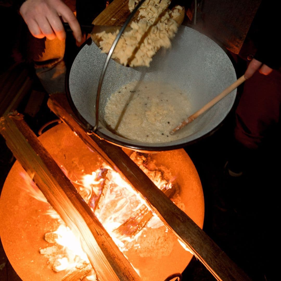 Auf unserem letzten winterlichen Camping-Abenteuer war auch der Emaille-Kessel mit im Gepäck. Ebenso die Zutaten für ein leckeres und einfaches Gericht, welches gemütlich über dem Feuer kochte, währenddem der Abend im Campingstuhl ausgeklungen werden konnte. Inspiration holten wir uns vorgängig auf der Seite des Rheintaler Ribelmais und kochten entsprechend ein Gericht von Anita Schneider nach.