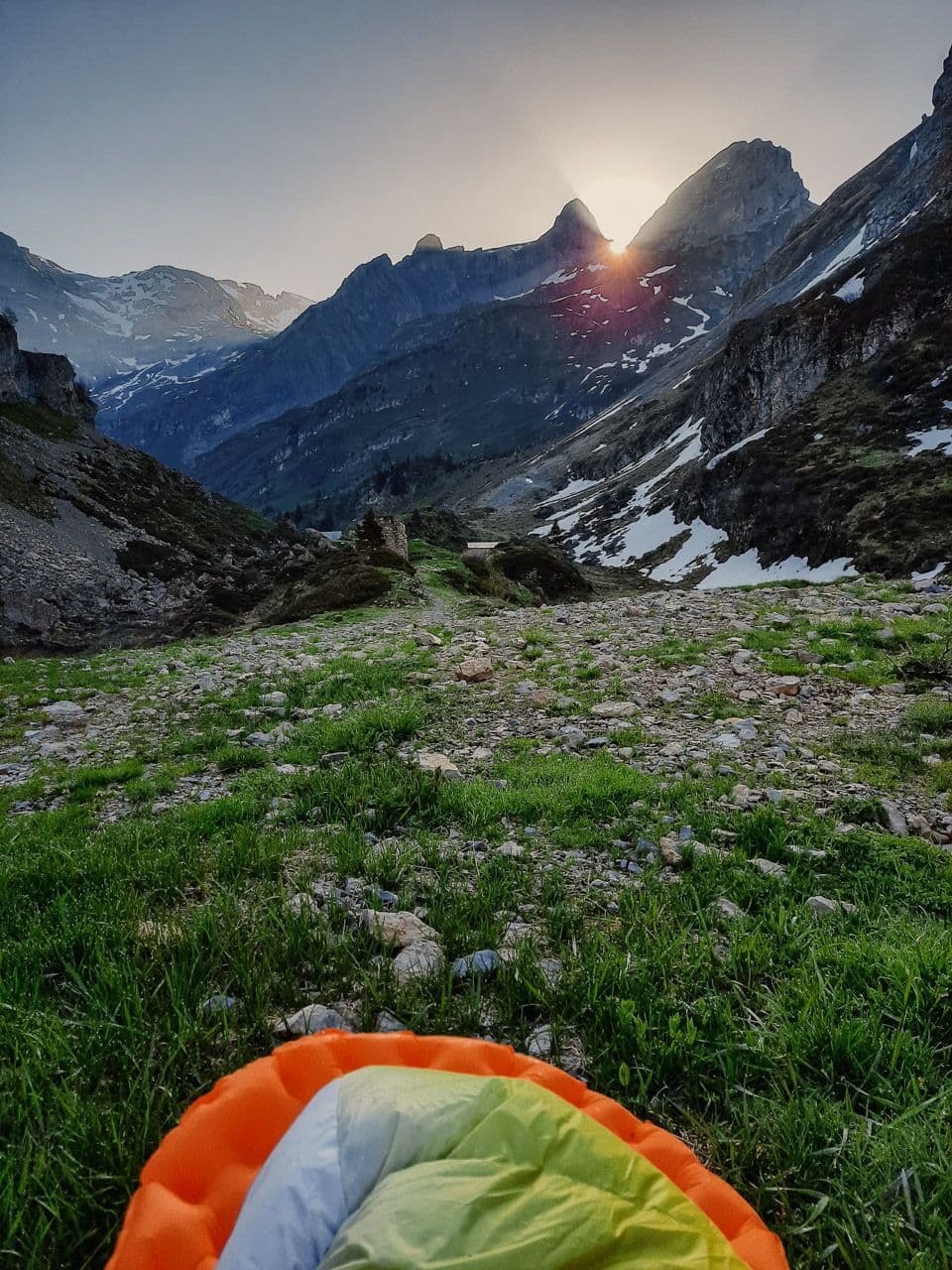 Übernachte nicht in der Nähe von Hütten und Alpen, falls doch, kontaktiere die Hütte oder den Bauern im Voraus und schlage eine Entschädigung für die Nutzung der sanitären Anlagen vor und konsumiere in der Hütte respektive kaufe Produkte auf der Alp.